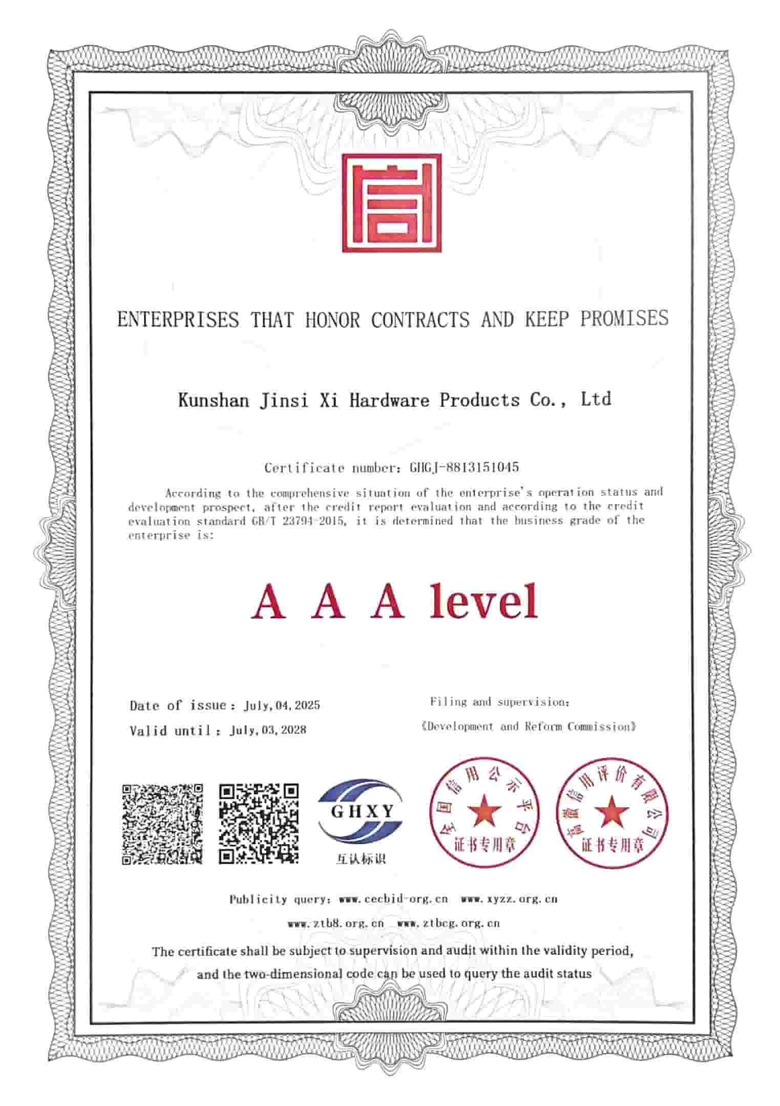 KunshanJINSIXISpolečnost Metalware Co., Ltd. byla oficiálně oceněna titulem „Podniky na úrovni AAA, které dodržují smlouvy a dodržují sliby“. JINSIXI se vždy drželo obchodní filozofie „jednota a spolupráce, pečlivost, snaha o dokonalost a dokonalost“, fungovalo bezúhonně, poskytovalo zákazníkům vysoce kvalitní služby a nakonec dosáhlo „dokonalého naplnění“.