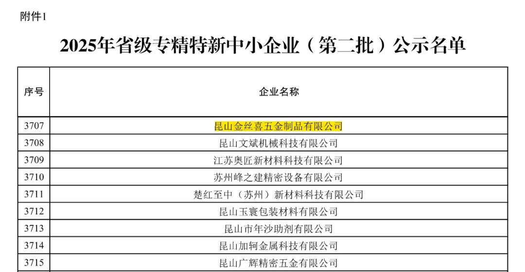 Slovenski Provinční ministerstvo průmyslu a informačních technologií provincie Jiangsu nedávno oficiálně oznámilo nejnovější várku specializovaných a sofistikovaných malých a středních podniků Jiangsu uznaných pro rok 2025. Společnost Kunshan Jinsixi Metalware Co., Ltd. byla úspěšně vybrána a oceněna titulem „Jiangsu Specialized and Sophisticated SMEs“ díky své hluboké technické akumulaci, vynikající kvalitě výrobků a neustálým inovacím v oblasti spojovacího materiálu.